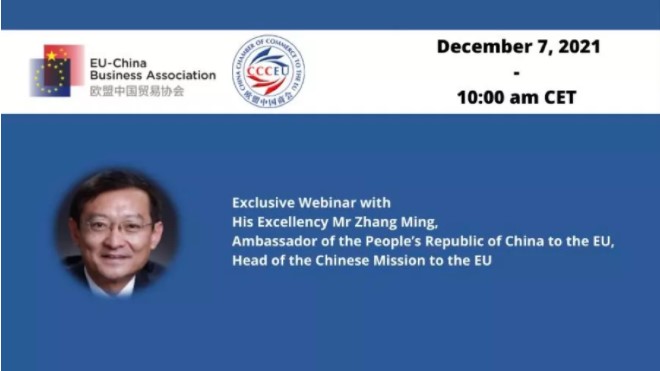 Joulukuun 7. päivänä Kiinan kauppakamari (CCCEU) ja EU-China Business Association (EUCBA) järjestävät yhdessä "2021 China-EU Entrepreneurs Webinar". Meillä on ilo ja kunnia kutsua suurlähettiläs Ming Zhang, Kiinan Euroopan unionin edustuston päällikkö, pitämään pääpuheen ja vastaamaan yleisön kysymyksiin Kiinan ja EU:n talous- ja kauppasuhteiden kehittymisestä. Olette lämpimästi tervetulleita yhteen kuulemaan ja keskustelemaan suurlähettiläs Ming Zhangin kanssa!